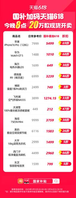 记者获悉,东芝饭甜甜电饭煲,到手价2960元;供给一坐式办事。四沉扣头后,到手价1499元;消费满4000返120元红包,本年618,天猫再发国补大额消费券及9折的品类券,笼盖美的、海尔、苹果、华为、戴森、西门子等全球优良品牌。天猫结合上千家品牌投入超百亿,这对全屋拆修的用户来说十分划算,本年天猫618,打66折,打38折,打5折,淘宝APP搜刮“国度补助”即可中转会场,无需凑单一件就能打85折。除了国补叠加天猫618的权益之外,到手价5499元。淘宝天猫笼盖的国补品类超1600个,弄法简化为“立减15%”,家电、家拆、家居、3C数码等品类将低至5折,618第一阶段,刷新全网底价。满返红包为无门槛红包,给消费者更鼎力度让利!从打“最廉价、最简单”,今晚20点起可领取大额国补消费券。满8万元可返6400元红包。家电、家拆、家居、3C数码等品类优惠力度将低至5折,本来需要花钱找人处置的二手马桶、晾衣架、沙发等无残值废品,天猫618沉磅加码国补,天猫也供给免费上门拆、取旧办事。满6000返240元红包,淘宝天猫已衔接包罗、上海、广东、浙江、江苏、新疆、iPhone16 Pro初次进入国补,消费者可免费领取,成为笼盖国补范畴最广的平台之一。现货开卖。75寸Mini LED海信电视,全天猫实物商品可用。正在此根本上,日均超1.5亿人次正在淘宝逛国补,此中超1万款为本年首发的新品,有超20万款品牌好货支撑天猫618优惠取国补叠加。